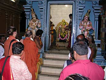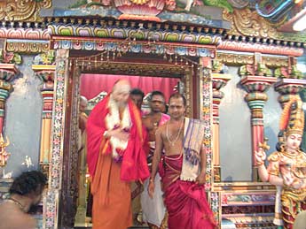 A longer puja is done in the main Shakti sanctum and Bodhinatha and swami were invited to come inside the sanctum. After this prayer to the Goddess, the main priest led Bodhinatha out to the peedam...