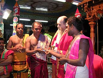 Bodhinatha is offered a small plaque by the Temple priests ...