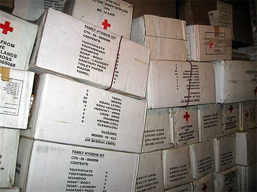 Red Cross Family Hygiene kits. In times of disaster, basic needs like toothpaste and soap are important.