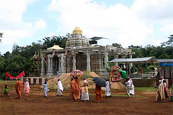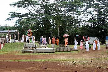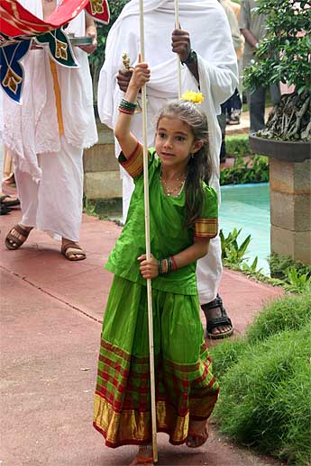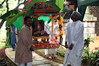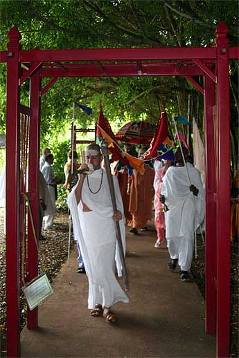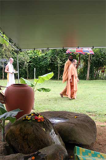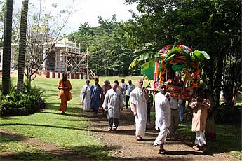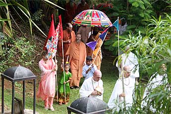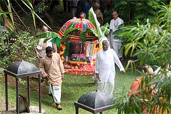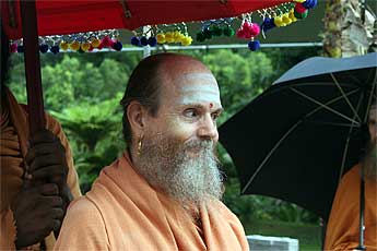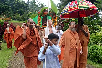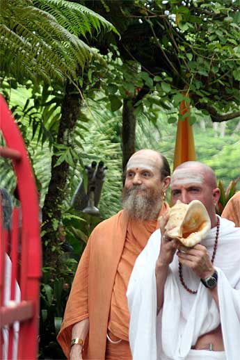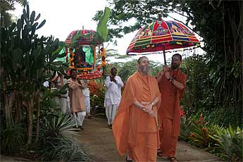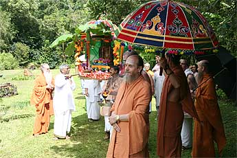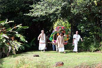 Later in the morning we had a special procession, taking Gurudeva's Paduka in a palanquin in a procession to show him all the many wonderful things that have come up at the Aadheenam and on San Marga. We invoke his presence first to come along with us.
