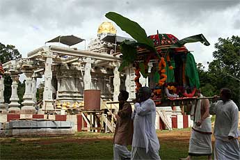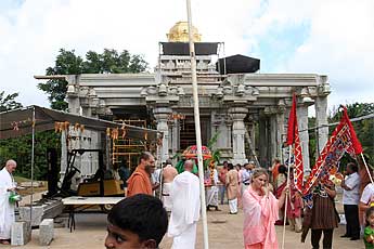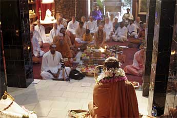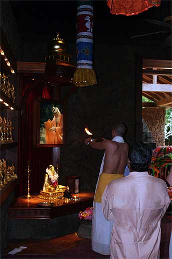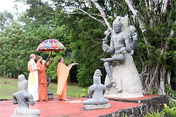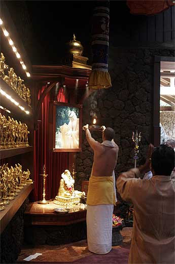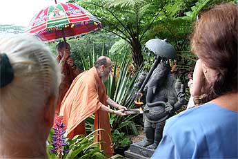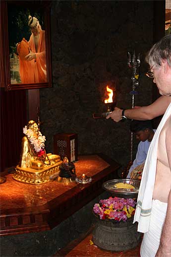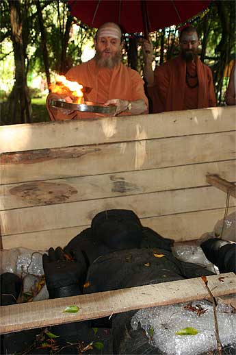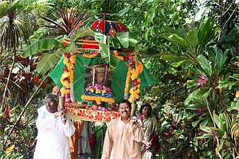 At each "station" of the journey, Bodhinatha offers arati first and the devotees worship after him. Here we show Gurudeva the statue of Arumugam, Six-Faced Murugan, who is still resting in his crate under the Banyan tree....