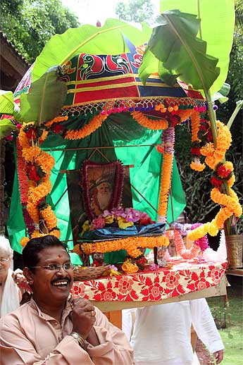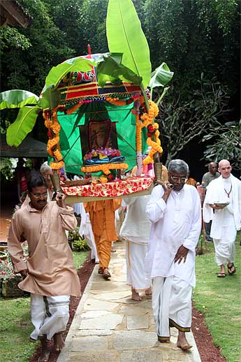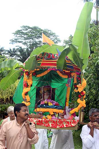 Out devotees carry the palanquin with Gurudeva's sandals and a photo.