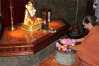 Inside the palanquin, these stone sandals from Gurudeva's shrine in Kadavul...
