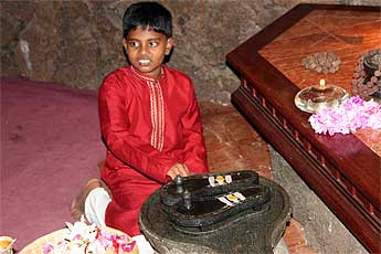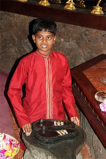 Hiranya is eight years old and enjoys helping in the temple... Today extra decorations were going on at Gurudeva's shrine. Eight-year olds have interesting ideas about their future. At first Hiranya wanted to be a Formula One Race car driver... His father suggested this may not be the best route to take and he might consider other options. Hiranya did that... Now he wants to be the First Malaysian Astronaut, and after his debut in space he would come to Kauai Aadheenam to be a monk.