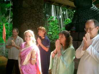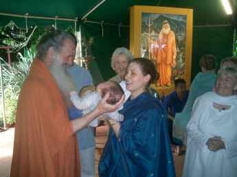 Afterwards devotees came to the feet of Satguru Bodhinatha for special blessings at this rare opportunity of putting life into a murthi. Kulapati Jothi Sendan poses with 5 week old son Veylan, as Bodhinatha holds his head. Someone in the crowd remarked "mmm... a future master?"
