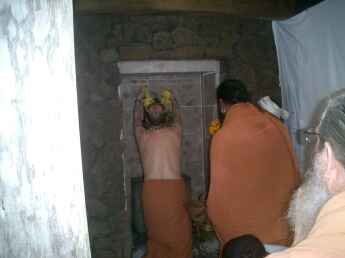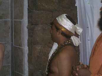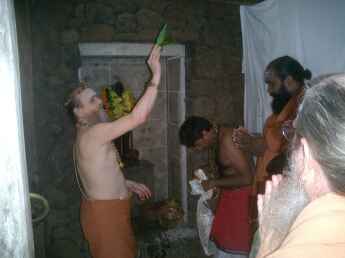 The Dandapani murthi was oiled by the devotees before the installation ceremony. We were advised by Punditji that this would create a special connection at this auspicious time, an opportunity only available at this special moment. We dipped our fingers in Sesame oil and lovingly rubbed it on Murugan.