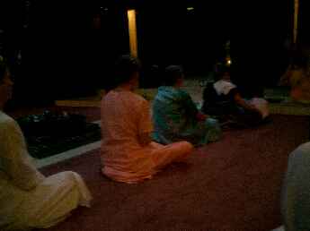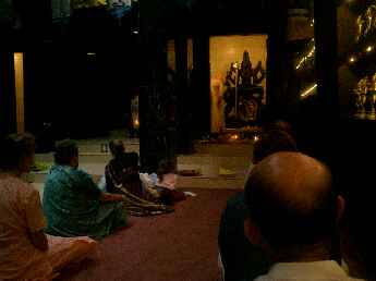 Devotees singing Muruga bhajans and Natchintanai while the curtain is closed. Priya Alahan and her mother Isani sang beautifully.