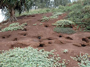 Tyler, who lives in Tennessee, was mesmerized by the sight of 7-foot-long seabirds soaring overhead by the hundreds, and nesting in tens of thousands of holes dug into the red clay, right on the ground right near the paths. He even reached down to touch a few, as the photos show. Not to mention the waves pounding the lava rock cliffs nearby.