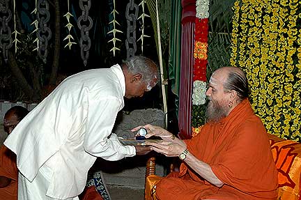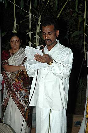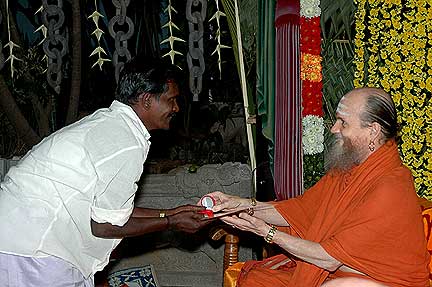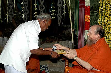 This is Chidambaram Sthapaty, the chief at our worksite who marks all the stones of Iraivan. He received a 10 gram 22 carat gold coin with a certificate.