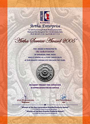 And the last of the Iraivan awardees is Sri Tangavelu Achari who is instrumental for all the pillar art on Iravan pillars and all other ornamental works. He is a good artist and a highly skilled craftsman. He also received a 10 gram 22 carat gold coin with a certificate, the highest awards presented.