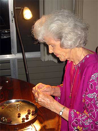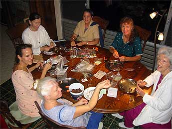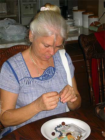 Kulapati Deva Seyon brings us photos from a recent Family Home evening on Kauai where our members gather to work on rudraksha beads. This seva has been bring in a steady income for Iraivan. In August, $1,364.00 worth of bead and malas were sold and the proceeds given to the Iraivan building fund and $768.00 in September. Deva sends these captions: