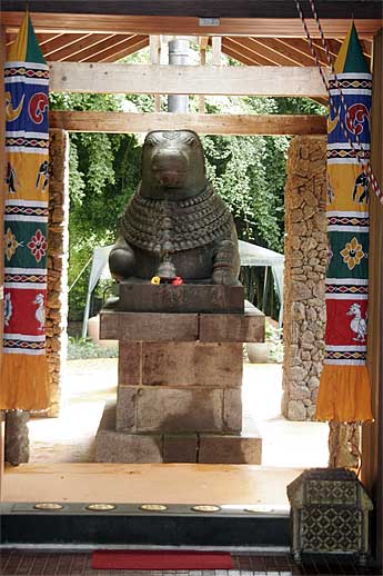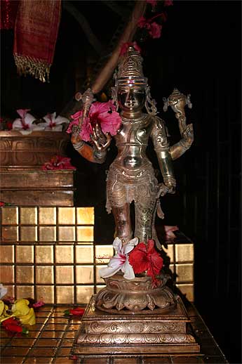 Pictures of sacred images here and there at the Aadheenam... here is "Hari Hara" an image of Siva which is half Siva and half Vishnu, showing they are one and the same. Also known as Shankaranarayanan, He was brought out from the side shrine to enjoy an abhishekam with Nataraja today on the monthly Ardra puja. You can see the unique murthi is made with one half copper color and the other brass.