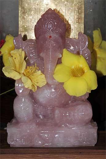 Pink Rose Quartz Ganesha, measuring almost a foot high, is being blessed in front of the Crystal Lingam before being sold in the Minimela...