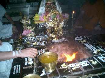 Paramacharya Palaniswami offers Tyeif prayers from the devotees to the fire.