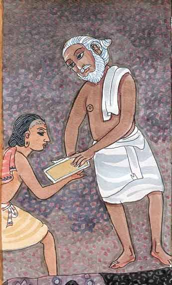 Here is Yogaswami with a student who has brought his schoolbooks to be blessed.