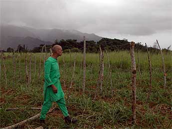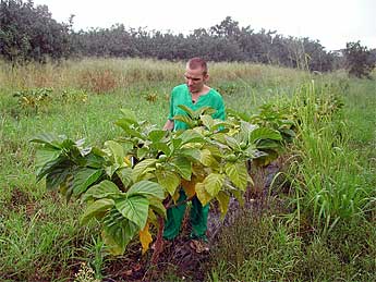 Though small, and only two years old, these Noni trees are already bearing lots of fruit. Tylernatha walks along the rows and picks ripe Noni to take back to the monastery.