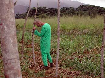 These Nara trees are the national trees of the Phillippines. They have the unusual behavior that logs remain alive and you can stick them in the ground like giant cuttings and they sprout... Sadhaka looks closely at some new buds from the cuttings that were put in the ground just three weeks ago.