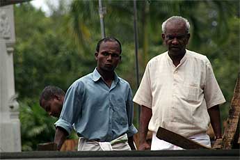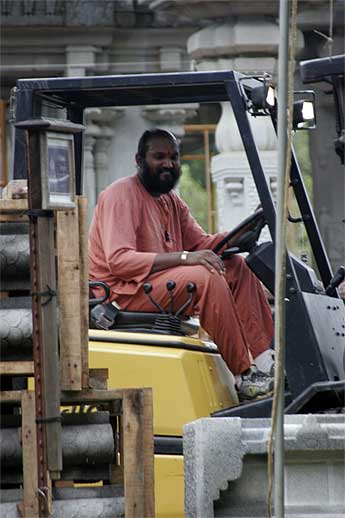 Our primary builder on the right with Silpi Chellaiya, who has been working on Iraivan Temple for 13 years, since he was just a young boy. They watch the stones coming out of the containers...