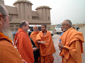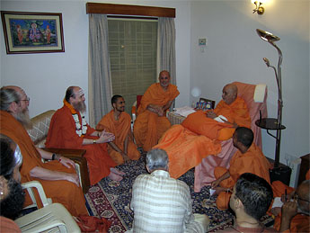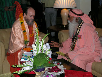Bodhinatha is greeted by Brahmavihariswami, the young swami at the center and Swami Atmaswarupdas, head of the London temple, at right.