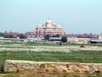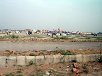 Another distance view. The temple built on flat farm land adjacent to the Yamuna River. Security is tight, the long entrance road included a sharp turn past a machine gun manned by several army soldiers.