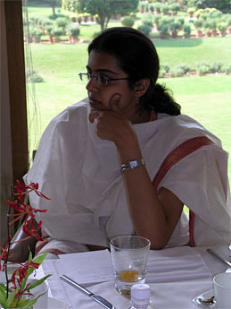The group included, starting from the left side of the temple, Mr. Bhardwarj, husband of Prabhakar, who is just visible behind Amit Kumar, photographer at far right. To the right of Arumugaswami is Madhu Kishwar, to his left MP Mohanty from Orissa, then Palaka Malik, daughter of our Delhi correspondent Rajiv Malik (you can see his head just behind Bodhinatha). We're enlisting Palaka as a youth correspondent.
