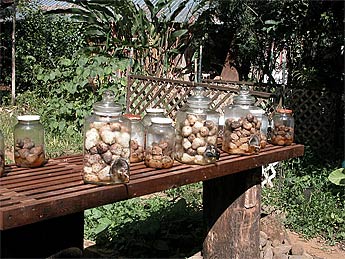 Noni is a tropical fruit with some marvelous medicinal properties. The monastery is growing a few trees. The odd-looking fruits are placed into jars in the sun, and the juices that ooze out help keep us healthy.