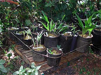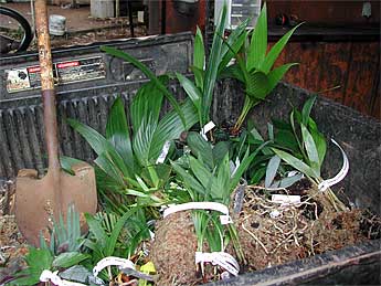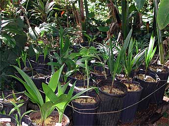 They were all put into deep pots, since palms have long roots. Here they are in the late afternoon ready to grow in our little propagation nursery.