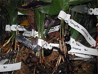 This is a close up of a few of them, showing the signs. The nursery made the white tags to identify the palms, but Palaniswami redid them all in aluminum which will last for several decades out in the tropical weather.