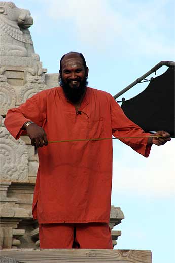 Yoginathaswami smiles for our camera while calling down measurements to his team on the ground...