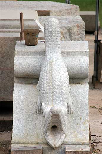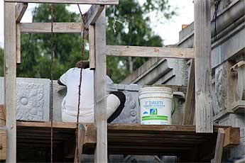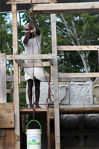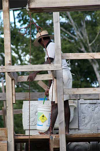 Old fashioned pulley hoist for buckets of mortar mixed below for jointing above.