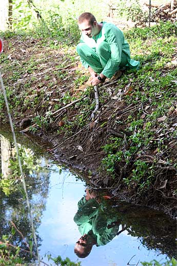 Here is Tyler, from Tennessee. In the mornings he has been going around to the different kulams, getting to work with and know everyone. And helping the Siddhidata Kulam in the afternoon. The ever important job of keeping our irrigation ditch free of debris...