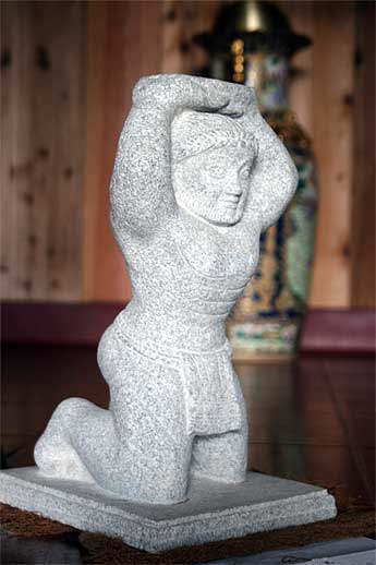 A beautiful Hawaii deva-bhuta-Menehune carved in India for the holding the Gomugai or water spout of Iraivan Temple.