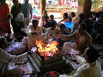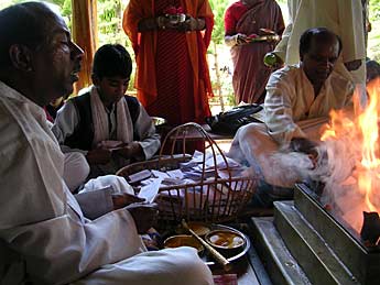 Devotees sing in chorus. Kulapati Moorghen gets ready with the other kulapatis for the Homa.