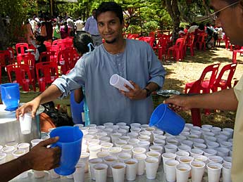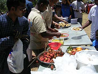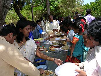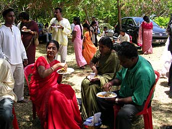 Devotees sit under the trees to share a meal...A great family time together in the darshan of Lord Ganesha.