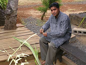 This year the festival was celebrated at the Park on December 22 and coordinated by the Himalayan Academy Committee of the Spiritual Park. Early morning a group was there to set up everything. Here is sishya Navind Sagam busy making some tornums for decorations.