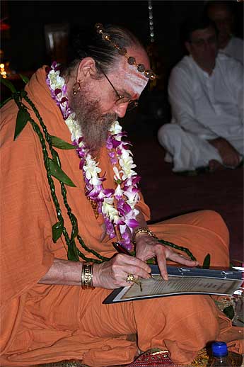 In fulfillment of Gurudeva's vision... Here Satguru Bodhinatha Veylanswami signs the Namakarana Certificate for Uma Sivanathan, who received her Namakarana ceremony today.