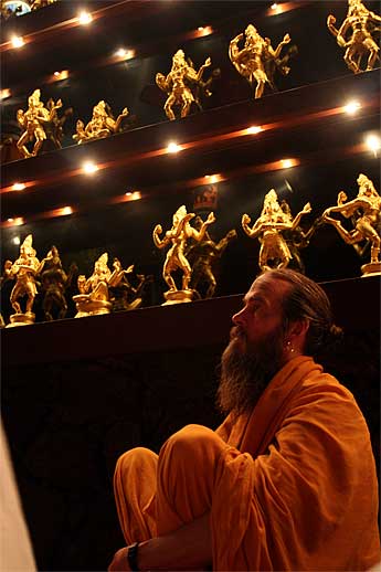 Acharya Kumarswami observing from underneath the luminous, gold-leafed Tandava statues.