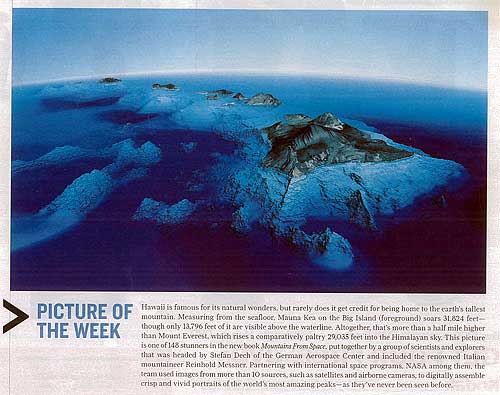From the stunning new book, Mountains from Space, our island home. Kauai is the oldest of the island, top upper left corner. In the foreground, the tallest mountain in the world, the still erupting Mauna Kea on the Big Island of Hawaii, at 31,824 feet from the ocean floor, half a mile higher than Mount Everest.