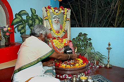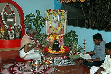 At the carving site in Bangalore, a puja for Gurudeva done by Jiva Rajasankara assisted by his son, Senthil.