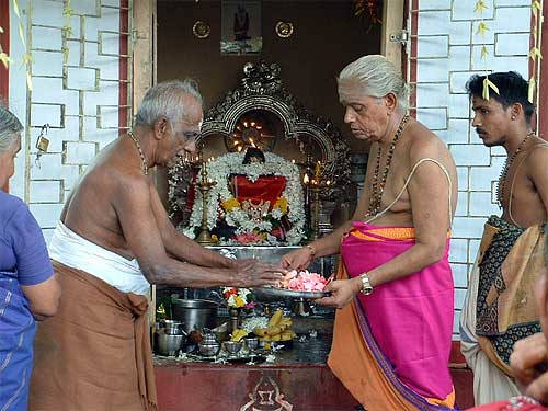The Temple's Chief Priest Sivasri Pranathartihara Kurukkal and Rishipathi Kanagaratnam performing the Krittika Deepam puja Sankalpam, last November....