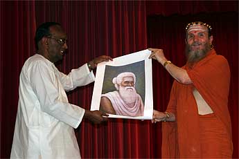 Bodhinatha presents the Sivathondan Nilayam with a painting of Satguru Yogaswami. Sri Siva Pasupathy receives it on behalf of the Sivathondan Nilayam.