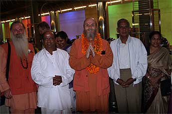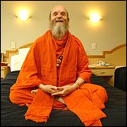 We were delivered our newspaper to the room this morning, and as we thumbed through the pages, we soon came to a large photo of Bodhinatha, sitting in lotus and smiling broadly. The article was headed "globe-trotting guru for the middle class, subtitled traditional hindu wisdom fits easily alongside cruise ships and computers, written by Julie Middleton. A nice article in the weekend herald, one of New Zealand's most prestigious papers. (text below)
