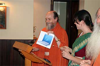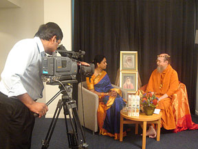 "The Australian TV station Sigaram interviewed Bodhinatha for an hour and a half today in Sydney. They are a major station serving the Tamil communities in the country. Mathini Wigneswaran, who came to Kauai with her mother last year, made all of the arrangements. And it was Mathini who crafted a series of questions that would guide the evening. With her questions as the story line, Bodhinatha took Australians through an overview of Gurudeva's work and mission, Yogaswami and our experiences in Sri Lanka, Iraivan and Kadavul temples, Hinduism Today magazine and life at the aadheenam. Perhaps more importantly, many of the questions toured areas of concern among the Hindus in Australia: mixed marriages, passing religion along to the next generation, and even the issue of whether moneys now being spent to build Hindu temples might be better spent on social service projects."