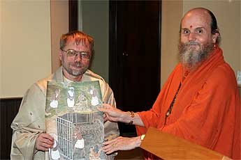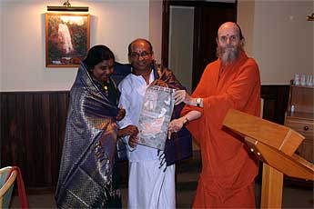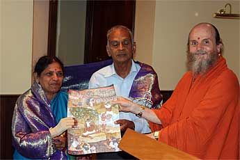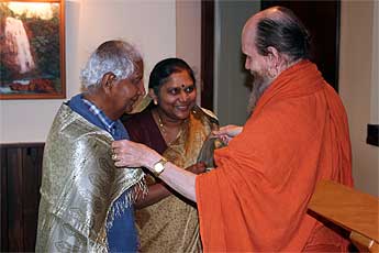 Last but not least, the dynamic Mrs Ratna Sithambaranathan and her husband. Each received a shawl and a painting that tells a story from our Guru Parampara. Mrs. Sithambaranathan is a star temple builder for Iraivan temple and one of our top fund raisers.