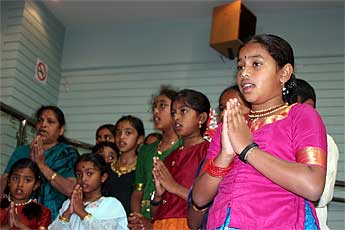 Mrs. Ratna Sithambaranathan guides a group of children in singing a few thevarams to welcome Bodhinatha.