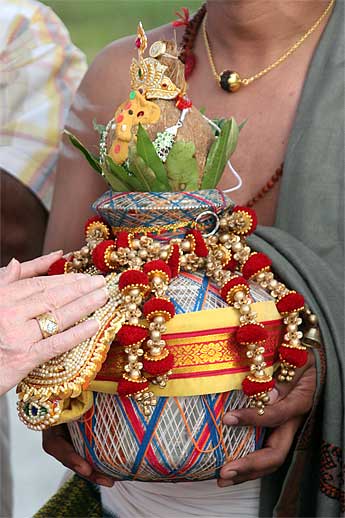 The temple president presents Bodhinatha with a tray of offerings.
