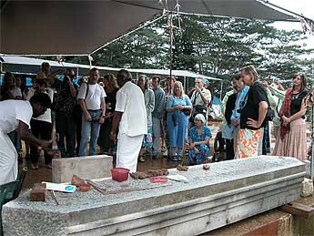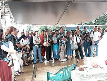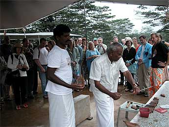 This was a short four-day phase ending today. A good sized group of visitors arrived for the tour. Sthapati shows them the tools of the trade.