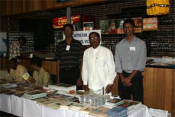 Sundaresan, middle, set up and ran with the help of the youth a display table with Himalayan Academy's publications.