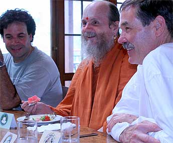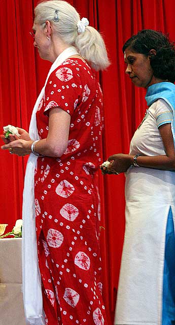 Lynda McClanahan and Suselah Periasamy approach Bodhinatha for vibhuti blessings.