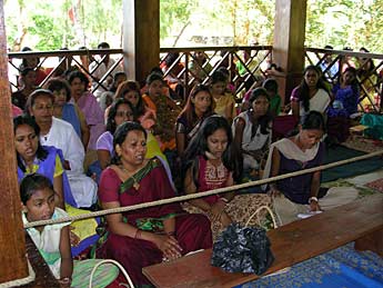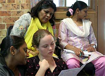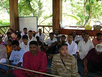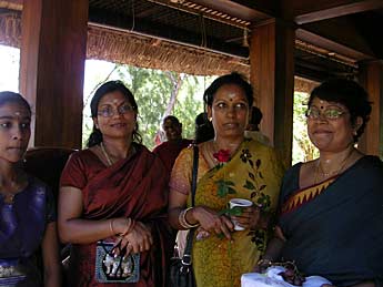 Ready for Bodhinatha's next lesson - Usha Shastri, Monica Sewpaul, Hema Patel and Priya Alahan. In his lessons, Bodhinatha used a great mix of presentation, individual activity and group activity. In the activities, we could use the Dooralong gardens to reflect, experience and share. Our stories and the sharing of our experiences gave Bodhinatha examples that he could then incorporate into his materials. Bodhinatha wants to make sure that the examples that he uses in his talks are "down to earth" and not soley from the "ivory cave".